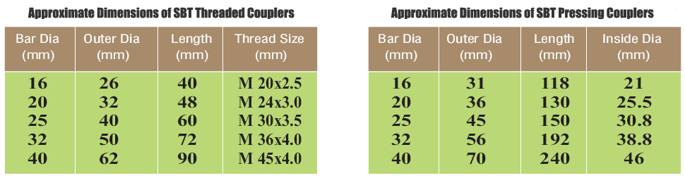 SBT Couplers are a parallel threaded mechanical splicing system for reinforcing bars diameter 16 to 40 mm and are designed to provide full tensile strength. They are manufactured in compliance with BS 8110, ACI 318, DIN 1045 and other international standards.
